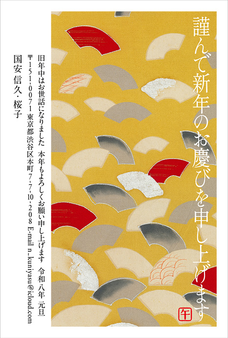 扇柄の着物です。赤や銀色のコントラストが美しい絵柄です。