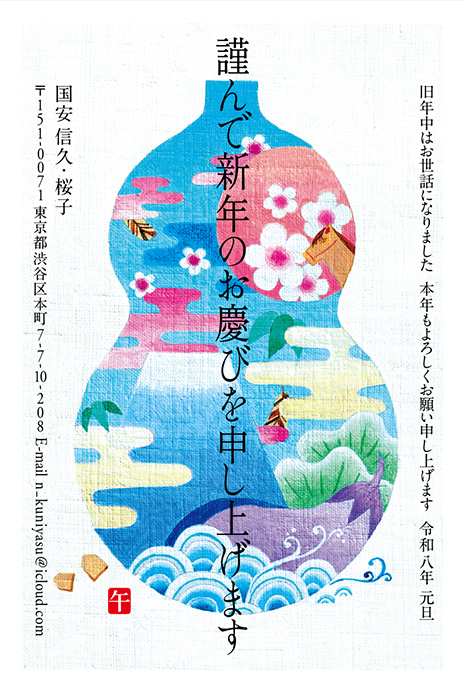 イラストレーター加藤小夜子氏の作品。瓢箪の中におめでたい絵柄が。飛び出た駒もアクセントに。