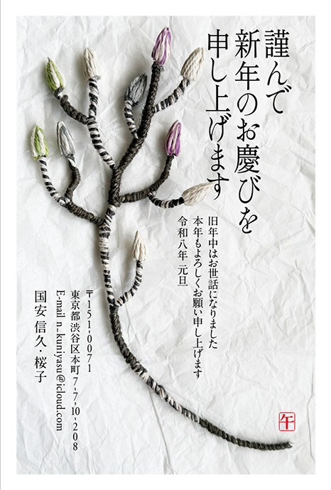 麻紐で作ったネコヤナギ。風合いのある紙を敷いて雰囲気を作りました。