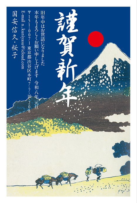 葛飾北斎の富岳三十六景より。背景を濃い青色にして初日の出をアクセントに加えました。