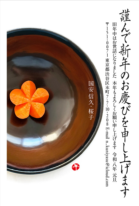 ねじり梅を器に盛り付けて。馬の好物で2026年の年賀状が完成しました。