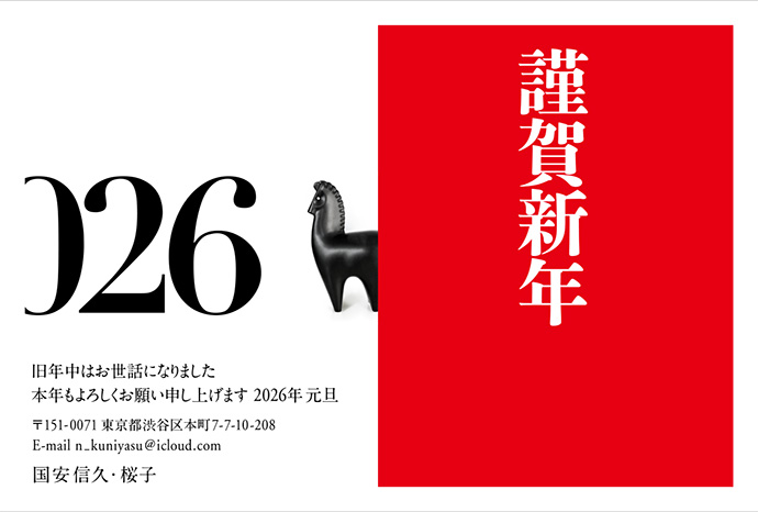 数字と馬と赤。シンプルながら大胆で目を引くデザインです。