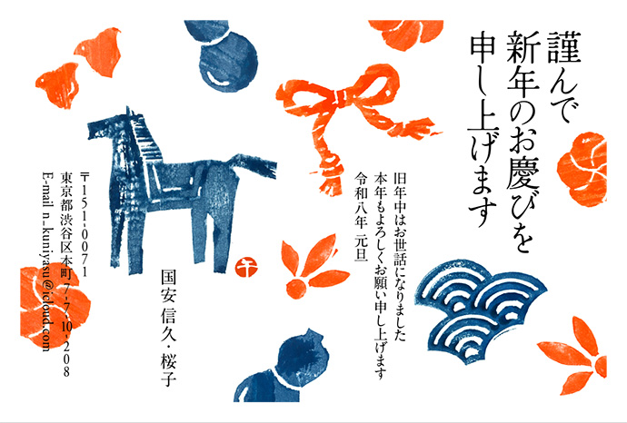 版画で作ったおめでたいモチーフを散りばめて。藍色と朱色がバランスよく広がっています。