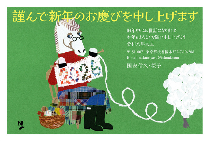 イラストレーター山本直孝氏の作品。羊の毛糸で馬が編み物。やっぱり発想が面白いですね。
