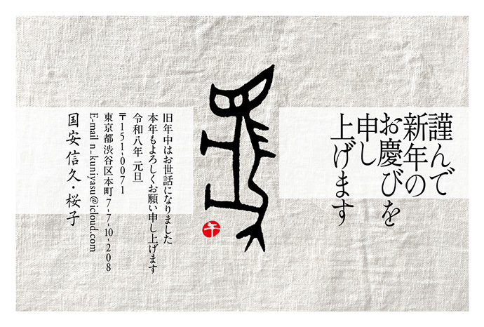 古代文字の馬と古布を組み合わせて。他にはないデザインに仕上げました。